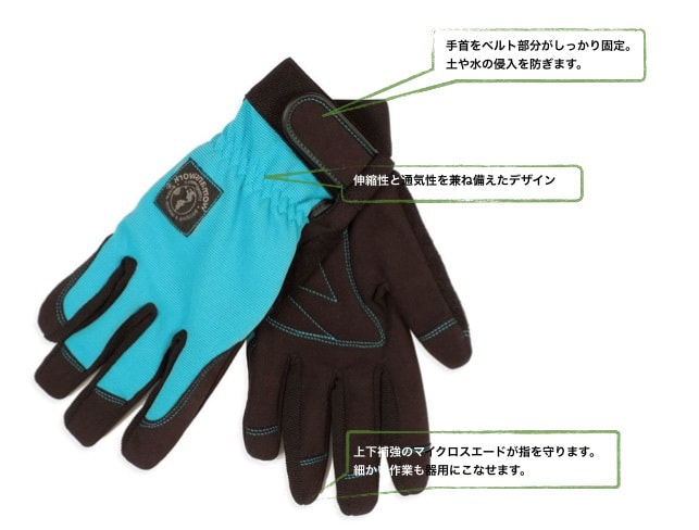指先の上下補強で、薔薇などの棘のある植物の扱いや、土いじりなど 幅広いガーデニング作業にもピッタリ。手首のベルトで土が入り込む心配もなし。