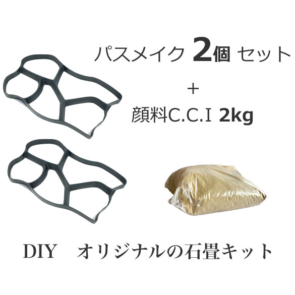 石目調に型抜きができるプラスチック製の枠のほかに、当社直輸入のコンクリート顔料C.C.Iをオプションとして2kgお付けしています。