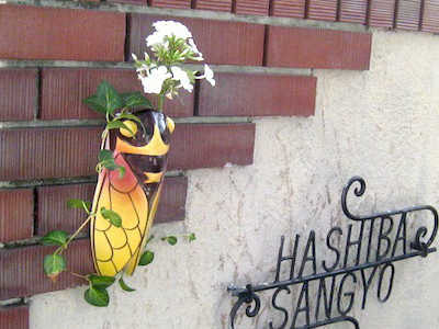 せみの頭部に穴が開いていて、花瓶のように花やグリーンを活けることができるタイプです。