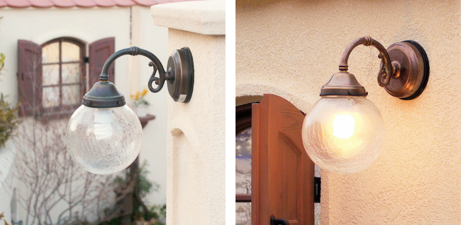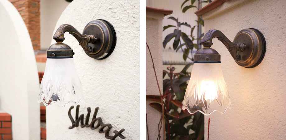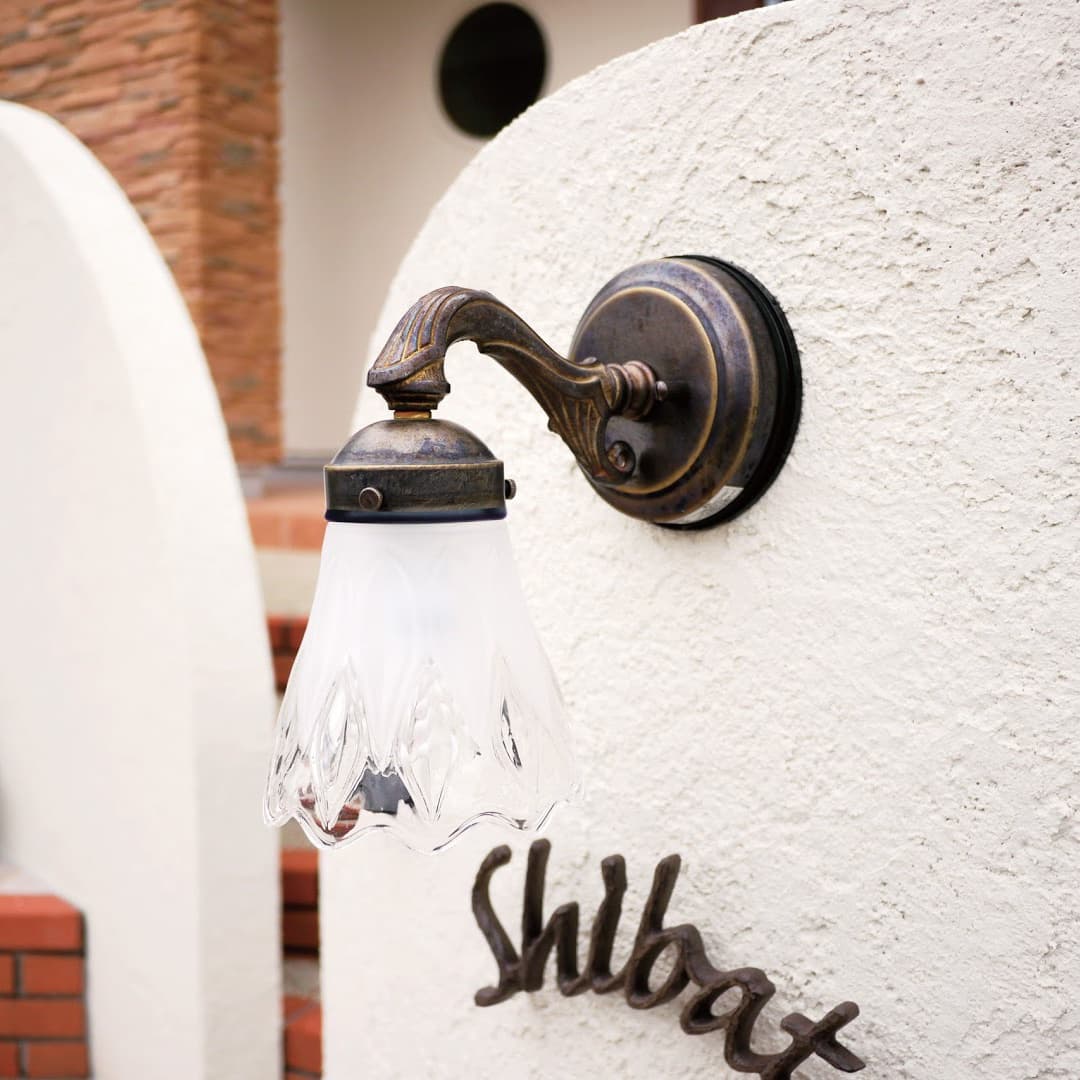 アンティークなガラスシェードと、ヨーロッパ製の真鍮鋳物アームが洋風の外構によく似合います。