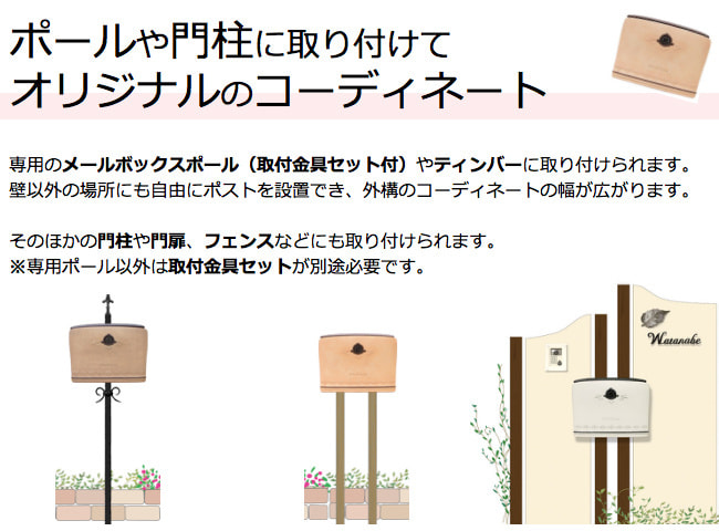 枕木・壁面・門扉・機能門柱・専用ポールなど様々な場所に設置可能です。
