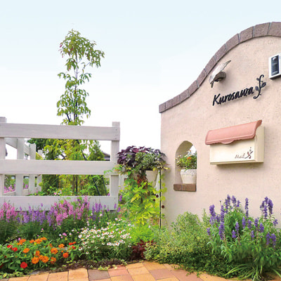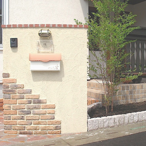 スタッコ塗りとスペイン瓦をイメージしてデザインされました。やわらかい色合いの塗り壁やアンティーク調のレンガ、洋風の玄関やアプローチにおすすめです。