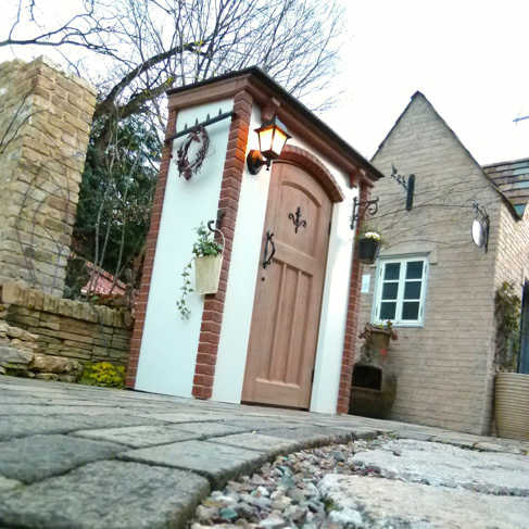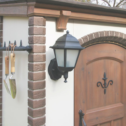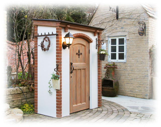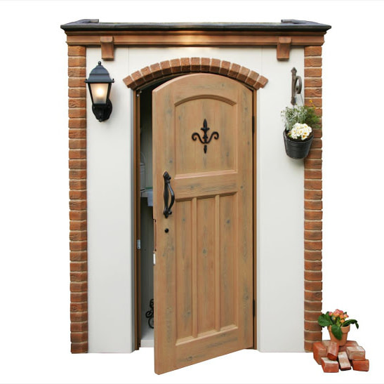 カンナキュートは、カンナより少し小さめで、丸い扉のキュートでスタイリッシュな物置です。レンガや木の部分(FRP製)は従来のカンナと同じ風合い。屋根はちょっとアンティークな瓦をモチーフにしたデザインが印象的な可愛い物置です。