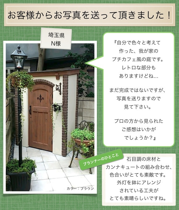 木やレンガの質感をリアルに表現し、扉や取っ手など、細部の意匠にこだわることで、お庭の外観を損なわない「見えてもいい」物置を実現しました。