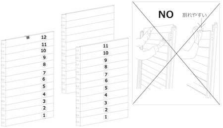 上の画像ように板材の凸が外れているように見えるものもございますが、凸は2個ついていれば問題ありません。