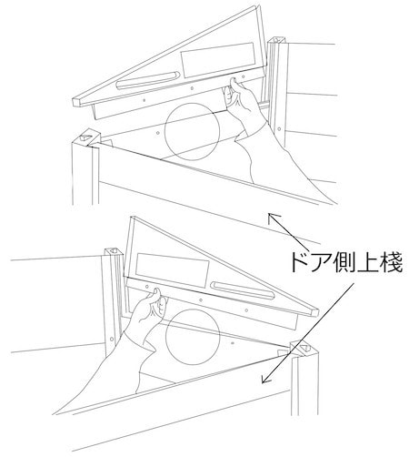 ドアの蝶番のネジの頭部分が上になるように付けてください。