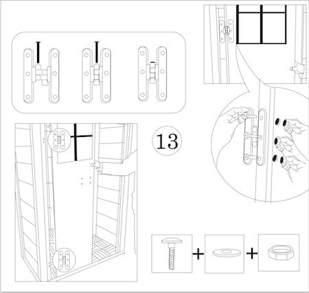 ドアをつけてあるヒンジの足を支柱のヒンジの穴位場に合わせてネジで固定します。