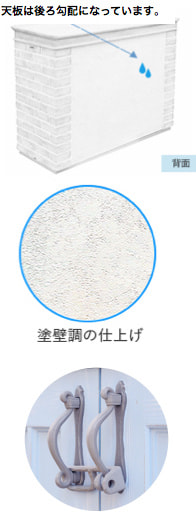 軽くて強度があるFRP(繊維強化プラスチック)を素材として使い、本物の様な木やレンガ、石材の質感を表現しています。プロバンス風の住宅や外構にぴったりの、可愛い洋風の収納庫です。