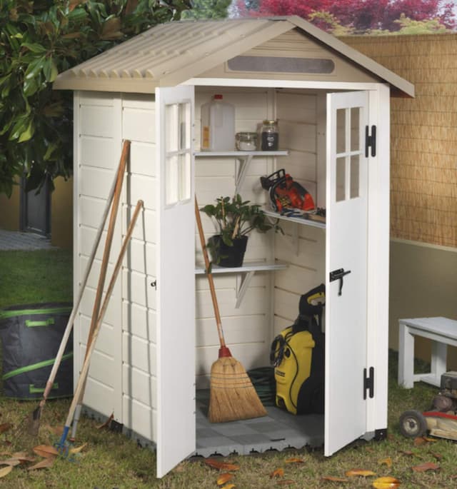 必要な道具を準備し、物置の設置場所を水平にする。 床板を組み、柱と壁板を順番に立てる。