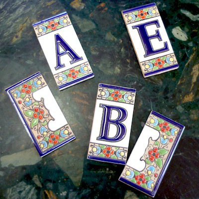 モザイクのデザインと色合いが鮮やかな、スペイン製のタイル表札。