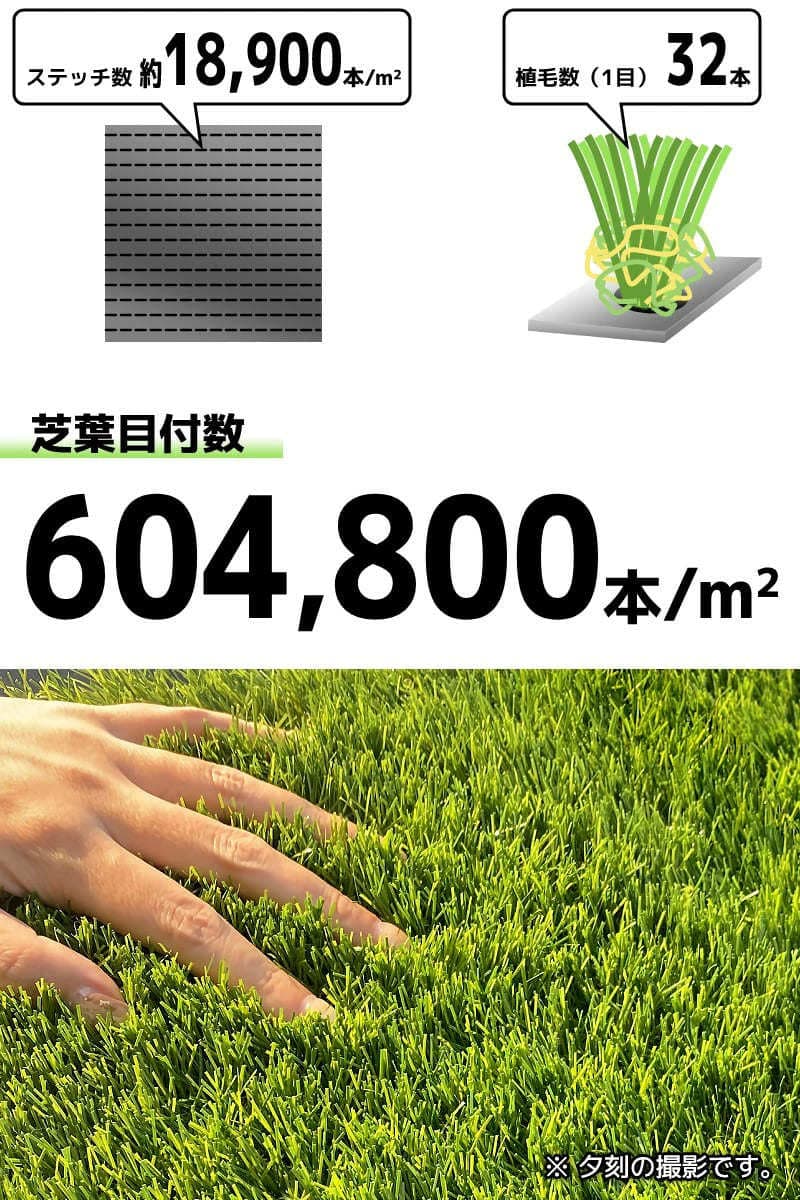 細かい縫い目の人工芝でも、1目に縫い込まれる芝の量が少なければその密度は落ちます。当店で取り扱う人工芝は、1目に32本の芝を縫い込むことで、芝の目の細かさと芝の量で測る密度は人工芝業界でも上位クラスに属します。