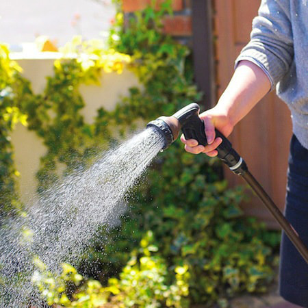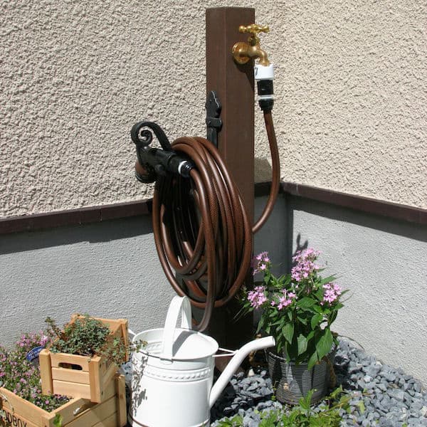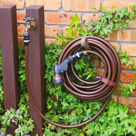 おしゃれなガーデンホースとノズル、コネクターのセット。ブラウンのホースが、お庭によく馴染みます。