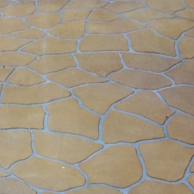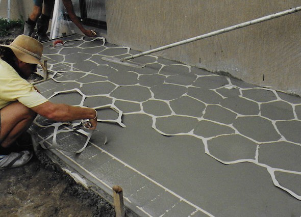 コンクリートの水分があるうちに光沢面が下になるようステンシルシートを敷き、上から顔料(着色剤)をまいてコテ等で仕上げます。乾いてきたら、ステンシルシートを剥がします。簡単に石を敷き詰めたような模様が出来上がります。