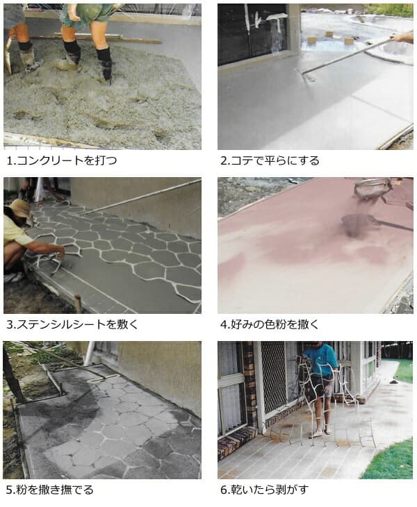 コンクリート打設時に、まだ水分があるうちにステンシルシートを敷き、顔料をまいてコテ等でならして仕上げます。