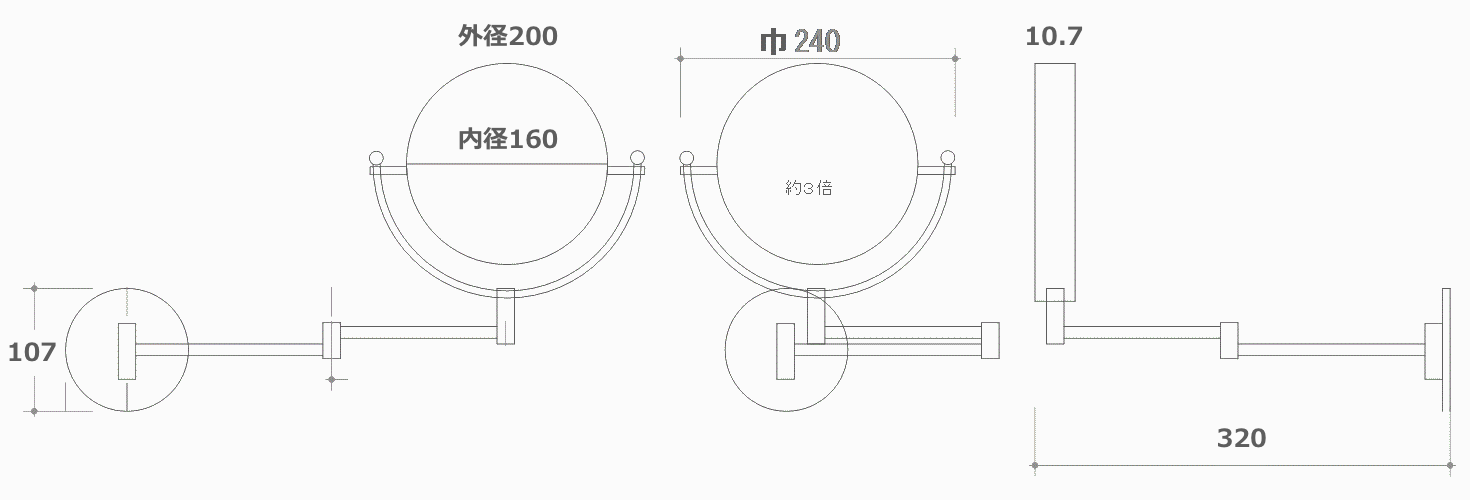 | サイズ | 高さ330×幅(最大時)500mm 直径:200/拡大鏡部分(約3倍強):160/奥行(最小)/60mm ※詳細は下記寸法図をご覧ください |