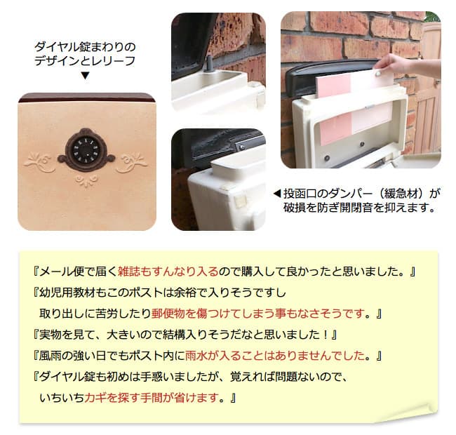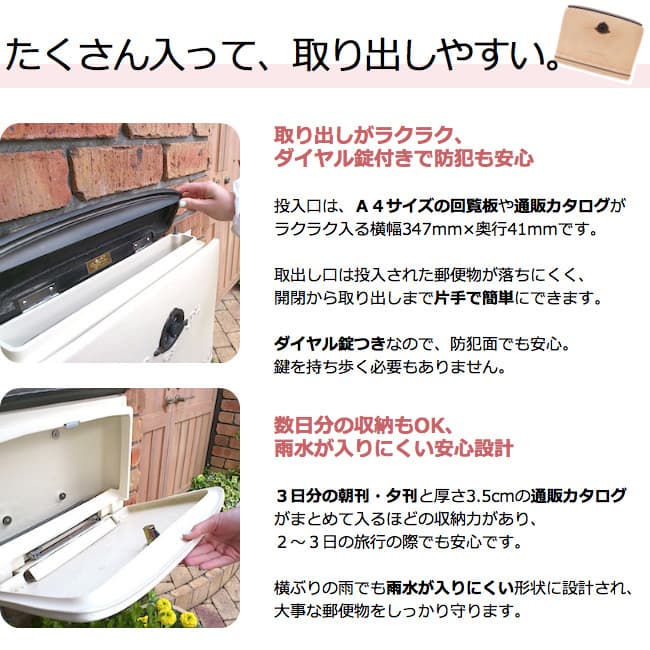 2つの番号で開錠するダイヤル錠は大切な郵便物や個人情報流出に安心な防犯設計です。ダイヤル錠なのでカギを持ち歩く必要や紛失する事もなく大変便利です。