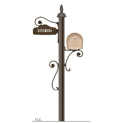 機能門柱「シャルルポール」、 郵便ポスト「ピュール」または「フローラ」、取付台座、専用表札「フロントサインC(ネームシールタイプ)」、オーナメントBのセットです。