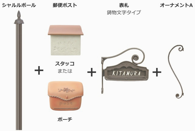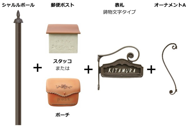 機能門柱「シャルルポール」、郵便ポスト「スタッコ」または「ポーチ」、専用表札「サイドサインF(鋳物文字タイプ)」、オーナメントAのセットです。