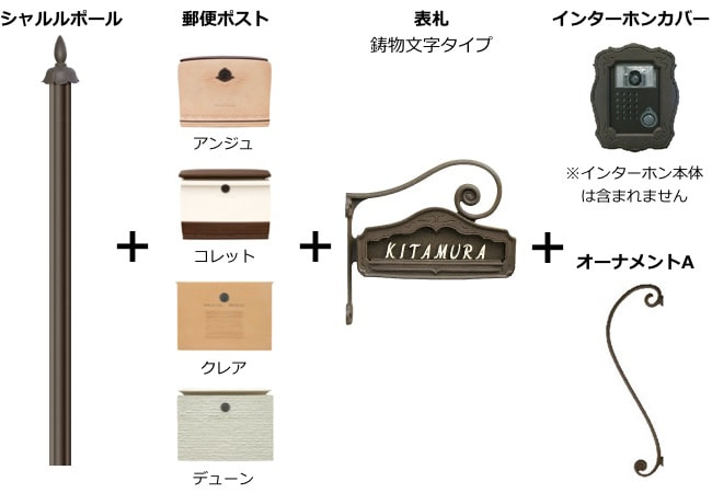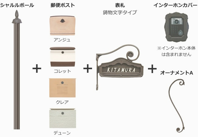 機能門柱「シャルルポール」、郵便ポスト(アンジュ・コレット・デューン・クレアのいずれか)、専用表札「サイドサインF(鋳物文字タイプ)」、専用インターホンカバー、オーナメントAのセットです。