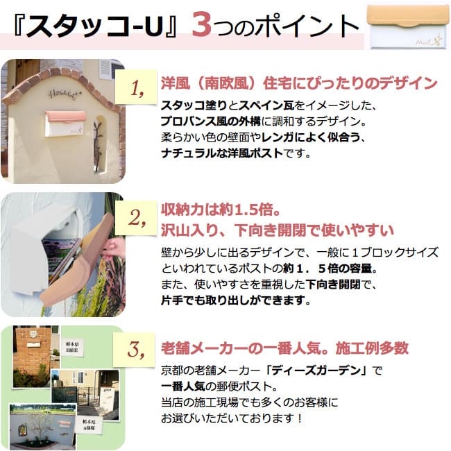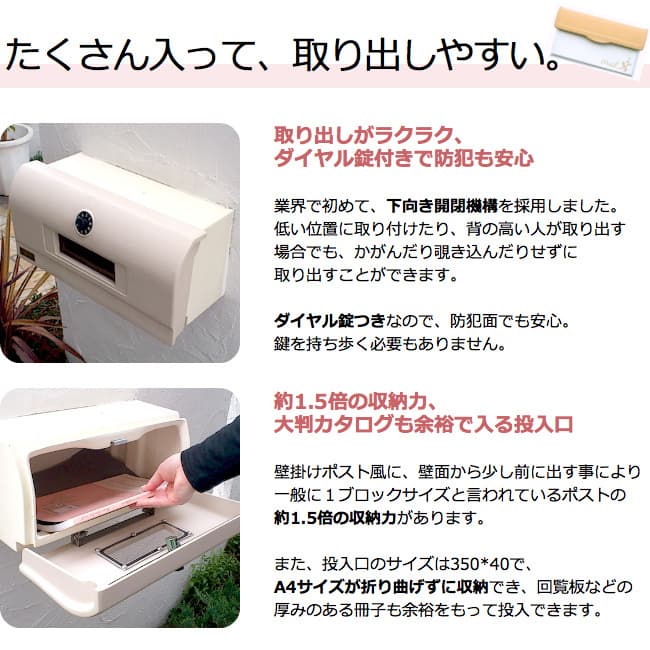 壁掛けポストのデザイン性と、埋め込みポストの収納力を兼ね備えています。