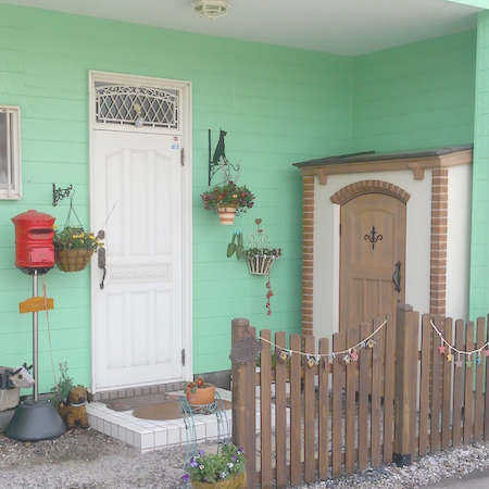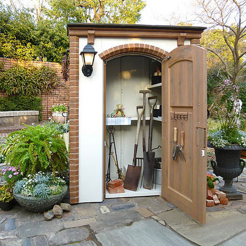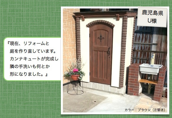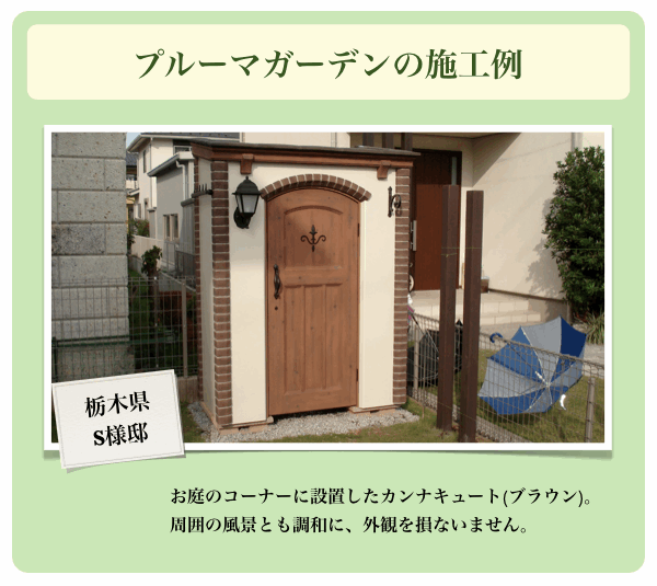 カンナキュートは、カンナより少し小さめで、丸い扉のキュートでスタイリッシュな物置です。レンガや木の部分(FRP製)は従来のカンナと同じ風合い。屋根はちょっとアンティークな瓦をモチーフにしたデザインが印象的な可愛い物置です。