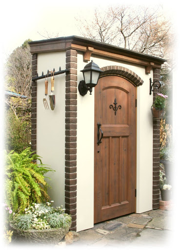 木やレンガの質感をリアルに表現し、扉や取っ手など、細部の意匠にこだわることで、お庭の外観を損なわない「見えてもいい」物置を実現しました。