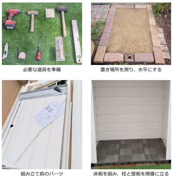 必要な道具を準備し、物置の設置場所を水平にする。 床板を組み、柱と壁板を順番に立てる。