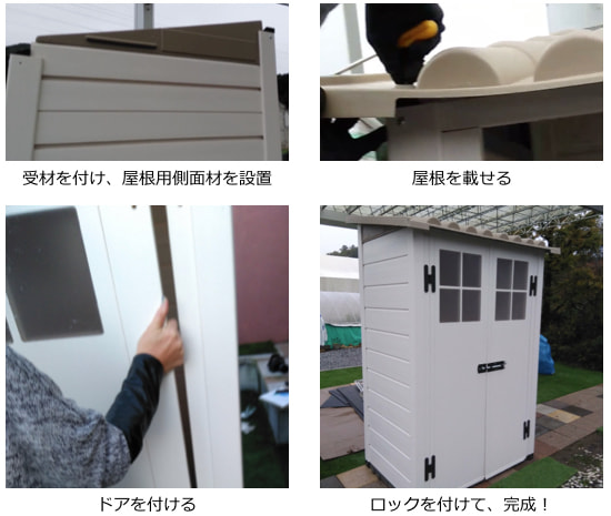 受け材をつけ、屋根用側面を設置し屋根を載せる。ドアを設置し、ロックをつければ完成!