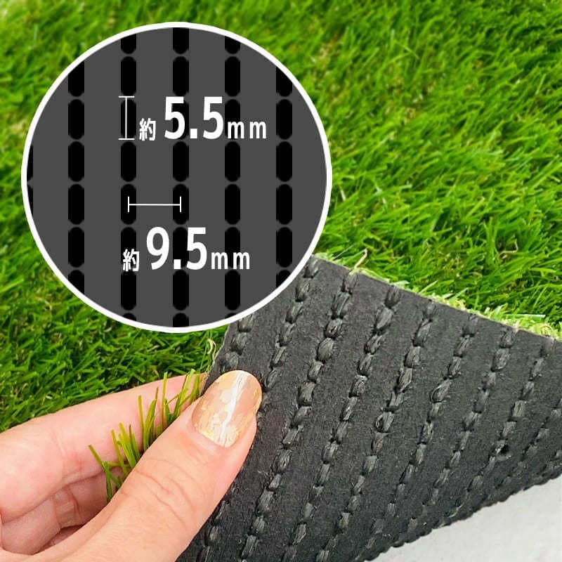縫い目の荒さ(1目の長さ)は約5.5mm、縫い目ラインの間隔は約9.5mm。ちょっと芝の間をかき分けた程度では、ベースの黒い生地が見えることはありません。