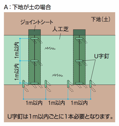 U字釘の間隔は1m以内になるようにしてください。W2.0m幅の人工芝の場合、幅方向にU字釘を3本使用してください。