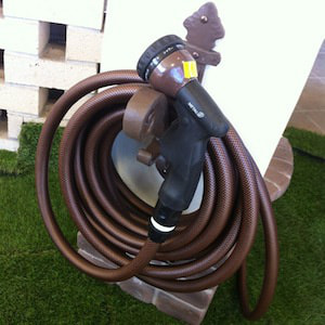 おしゃれなガーデンホースとノズル、コネクターのセット。ブラウンのホースが、お庭によく馴染みます。